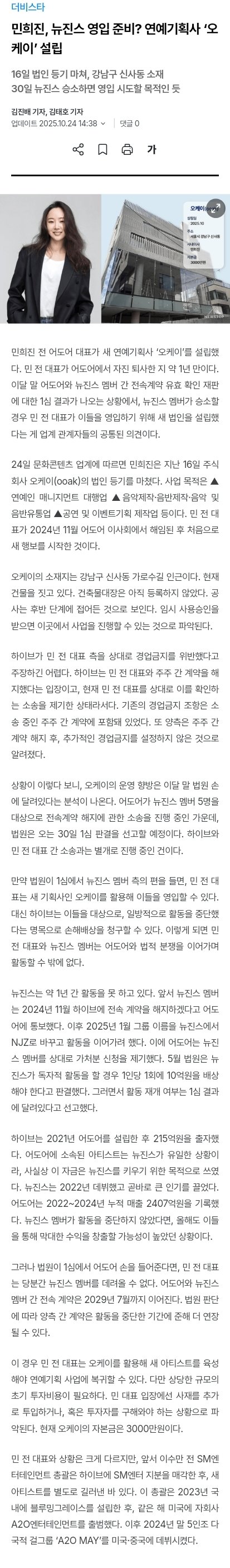 민희진, 뉴진스 영입 준비? 연예기획사 ‘오케이’ 설립
