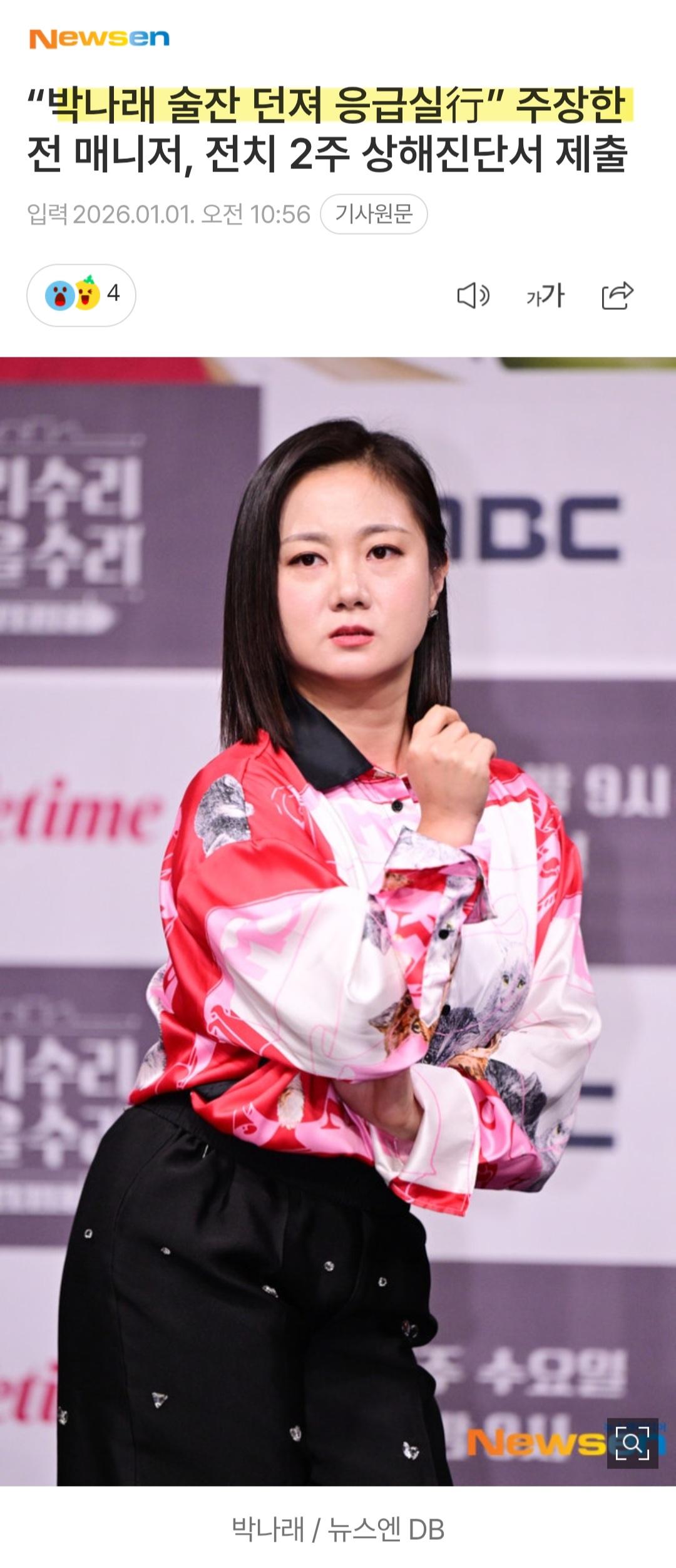 박나래 전 매니저...전치 2주 상해진단서 제출 호랭이신사 0 0 0 0 1시간전 주소복사 복사되었습니다! 바닥에 던졌다고 하니 던지긴 던졌네요...사람을 향해 물건 던지는 거 참... 0 0