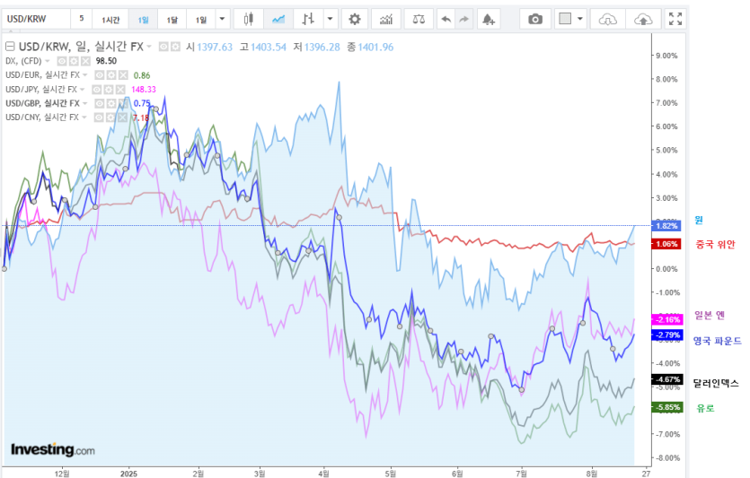 다른 나라 화폐와 비교해본 환율 여의도피멍 0 1018 0 0 08.22 08:00 주소복사 복사되었습니다! 12월 초에는 엔화를 제외한 대부분의 통화가 달러대비 약했음 지금은 대다수의 통화가 달러대비 강함(유로 -5.85% 파운드 -2.79% 엔 -2.16%) 그런데 원화만 유독 튐 0 0
