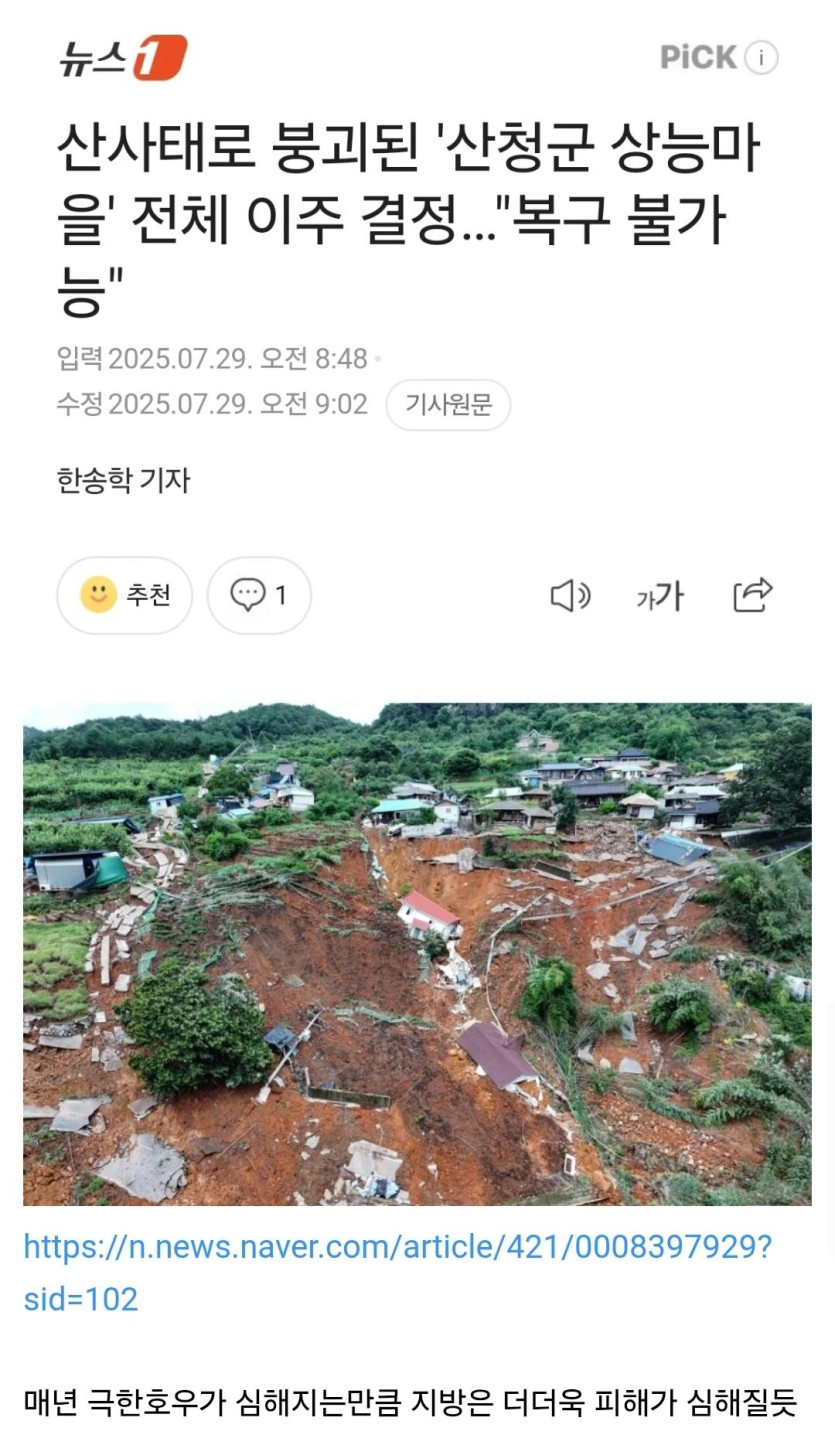 산사태로 붕괴된 '산청군 상능마을' 전체 이주 결정…"복구 불가능"