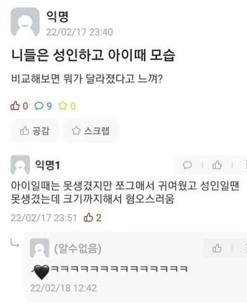 성인하고 애기 때 모습 비교하면 뭐가 달라졌다고 느껴져?