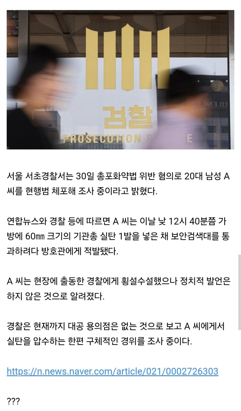 [속보]기관총 실탄 들고 서울중앙지검 들어가려던 20대 남성 체포