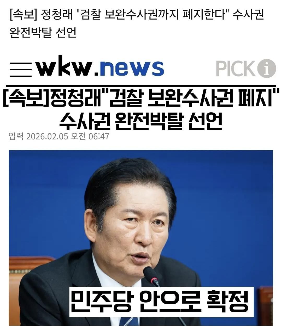 [속보 정청래 "검찰 보완수사권까지 폐지한다" 수사권 완전박탈 선언