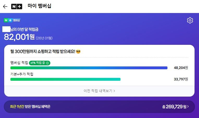 1월달에 받은 "네이버 멤버쉽 추가 적립금"만으로도 이미 10개월치 뽕을 뽑았음.. 앞으로는 쓸때마다 이득인 셈
