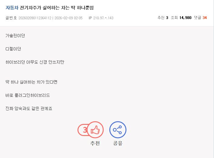 전기차 차주가 싫어하는 차 ㄷㄷㄷㄷㄷㄷㄷㄷㄷㄷㄷㄷ 밤에는라면 10 15 0 0 2시간전 주소복사 복사되었습니다! 플하가 충전칸 잡아먹는다고 싫어함 ㄷㄷㄷㄷㄷㄷㄷㄷㄷㄷㄷㄷㄷㄷㄷ 0 0