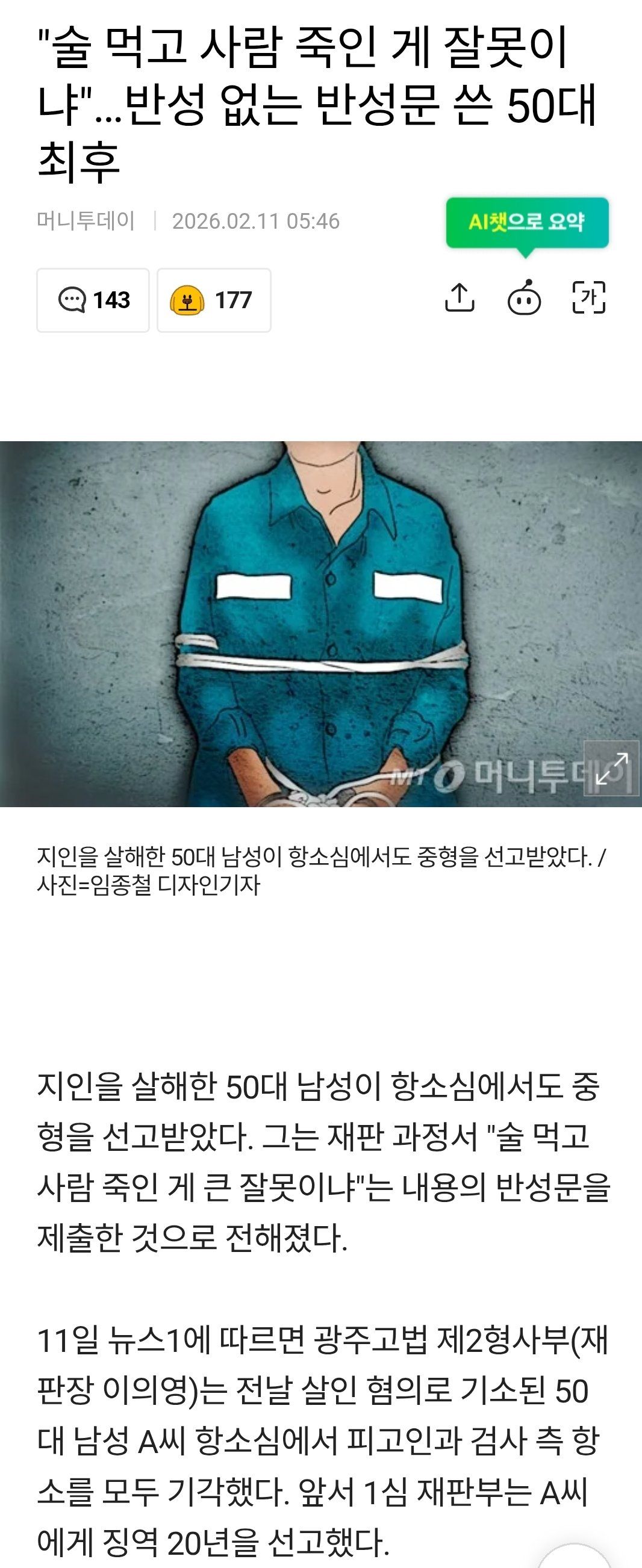 판새에게 잘 못했다고 안하니 20년형이구나... 판새한테 잘 못했다고 했으면 10년으로 줄여줬을라나?