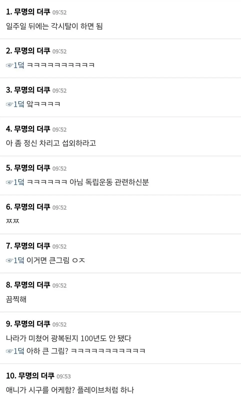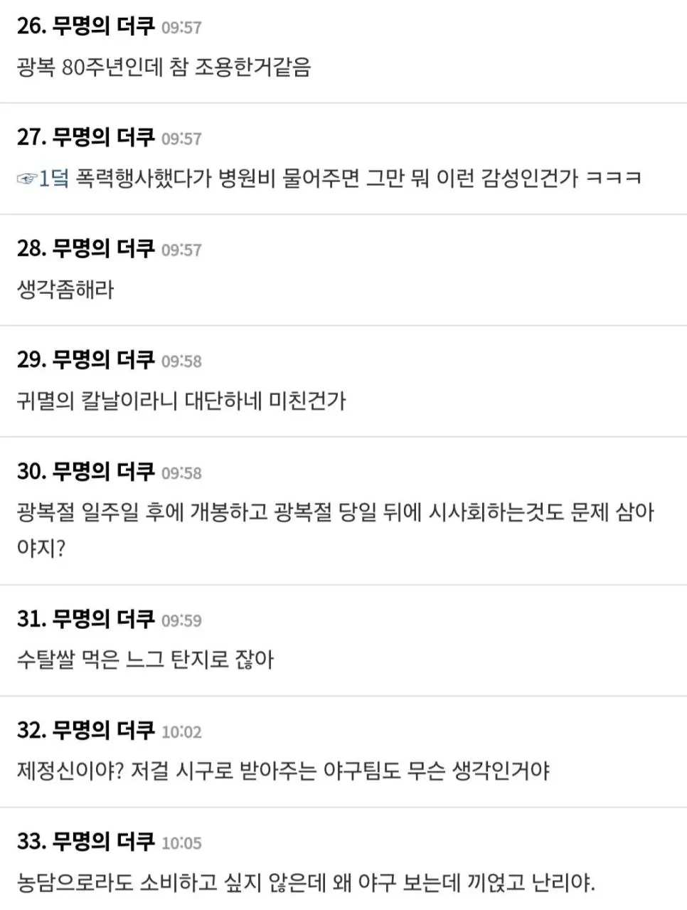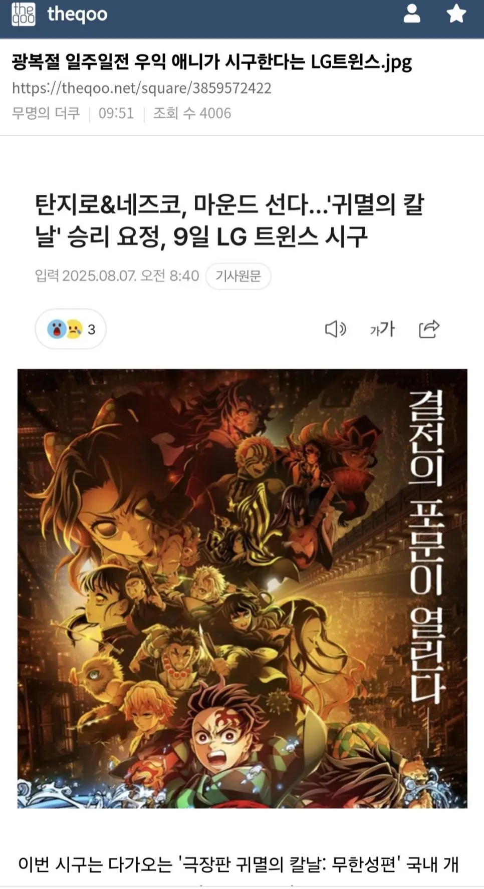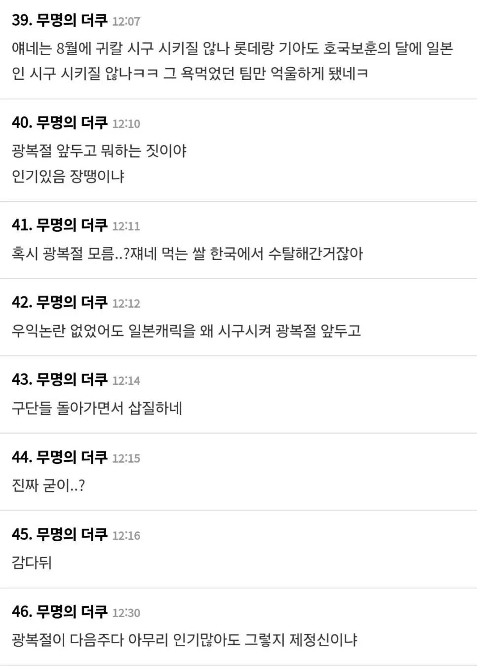 LG트윈스의 귀멸의칼날 시구 이벤트 근황.jpg Kim대리 0 1006 0 0 08.09 17:00 주소복사 복사되었습니다! 8월 9일 귀칼 극장판 광고차 시구 이벤트 함 헌데 이때가 광복절 일주일 전이라고 게거품 물며 어그로 끄는 터쿠 어그로 끌려서 평소 관심도 없던 독립운동가 빙의해 댓글 ㅈ랄난 아줌마들 취소 엔딩 또 더쿠냐... 0 0