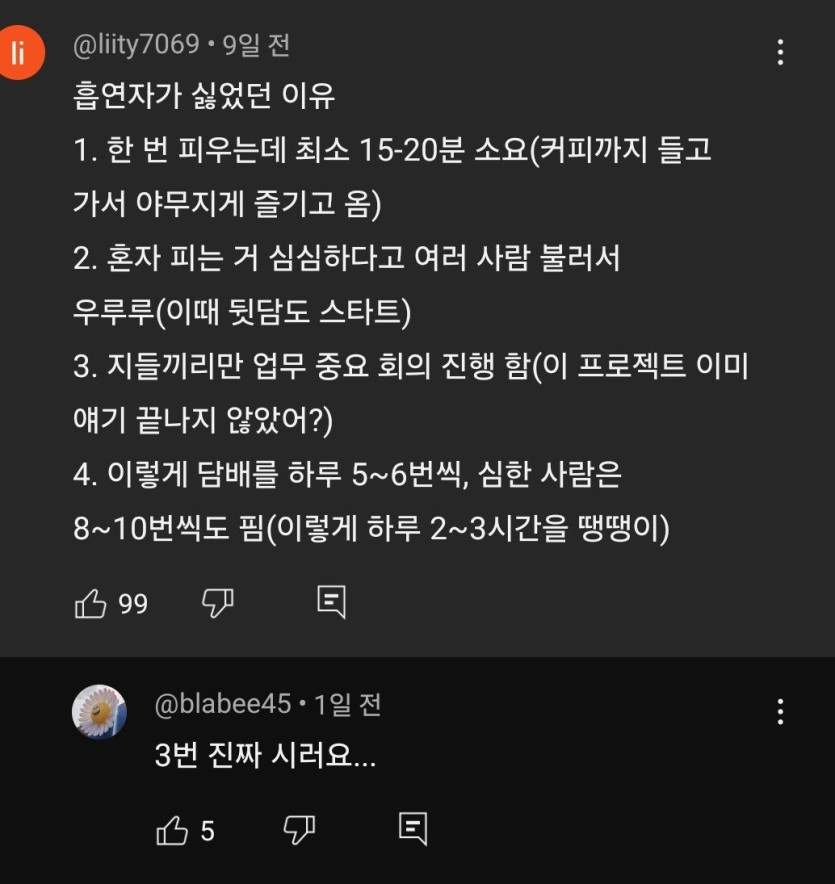 사람들이 흡연자를 싫어하는 진짜 이유 거울돌쇠 0 1003 0 0 08.25 13:00 주소복사 복사되었습니다! 나는 존나일하고있는데 한번 나가면 30분씩 삐대다가 들어옴 ㅋㅋ 그것도 하루에 여러번 가니까 하루2시간은 담배로 꿀빨고있음 0 0
