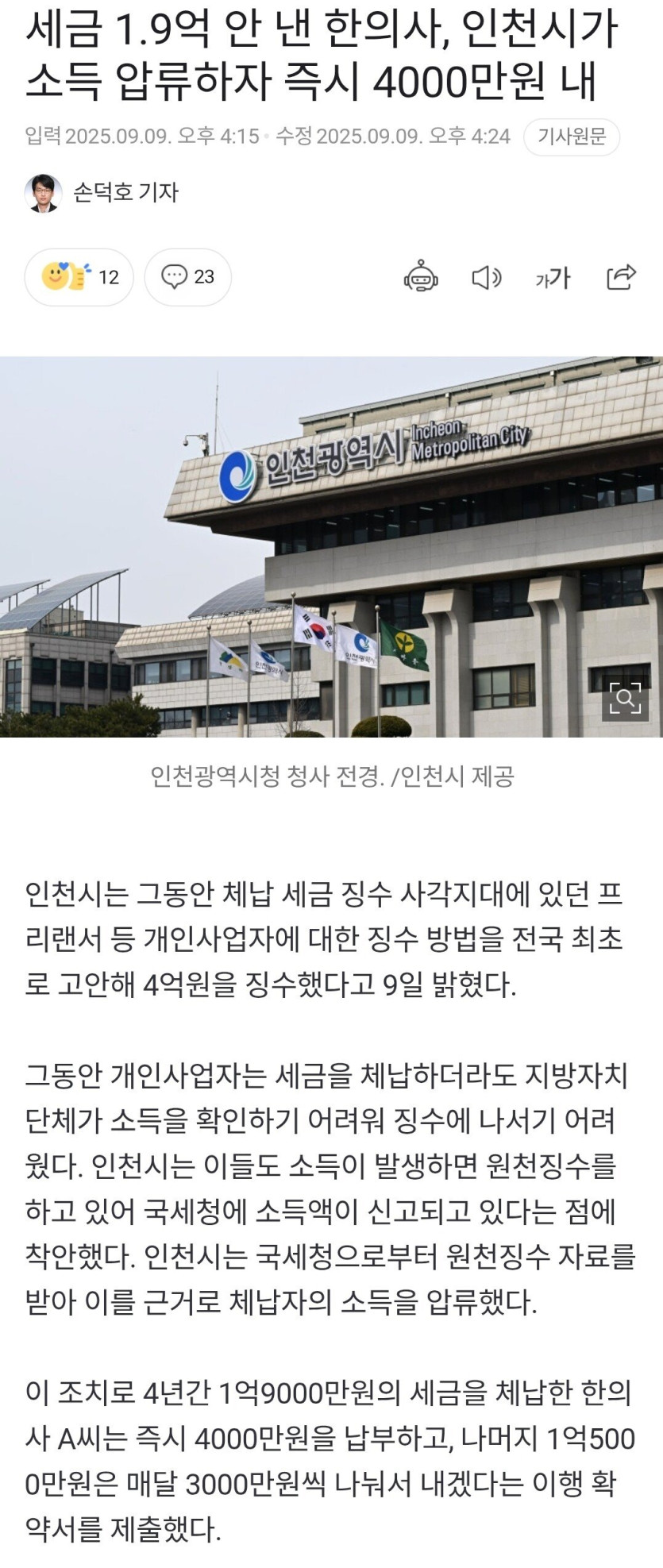 세금 1.9억 탈세한 의료인, 소득 압류하자 화들짝 놀라 납부 Elendil 0 1007 0 0 09.09 21:00 주소복사 복사되었습니다! https://n.news.naver.com/article/366/0001106655 https://n.news.naver.com/article/366/0001106655 0 0