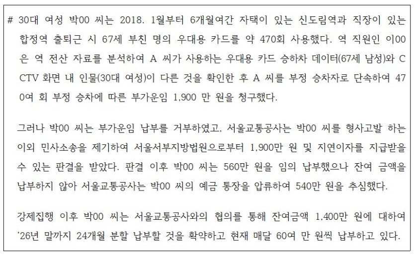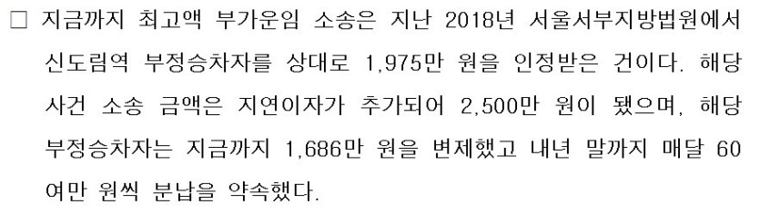 서울교통공사가 승소한 부정승차 역대 최고액 음란천사 0 1006 0 0 08.08 04:42 주소복사 복사되었습니다! 2018년 1월부터 6개월간부친용 경로카드로 출퇴근하던 30대 여성,적발 뒤 1900만원을 청구했으나여성은 납부를 거부했고결국 민형사 소송에 돌입해 지연이자까지 2500만원 판결 받자560만원만 임의납부하고 추가 납부를 거부,강제집행으로 540만원을 추가로 추심하면서 납부를 시작지금까지 1686만원 변제했으며매달 60만원씩 갚고 있는 중 0 0