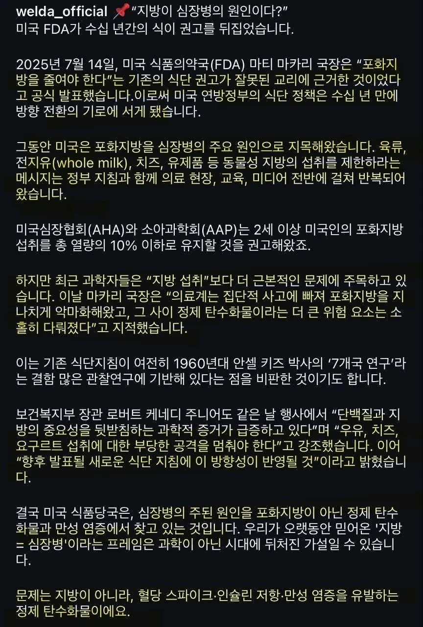 미국 FDA의 충격적인 건강관련 공식 발표. Weltenbaum 0 1004 0 0 08.10 10:42 주소복사 복사되었습니다! 1960년대 부터 지금까지몇십년 동안 지방을 악마화 했던 미국에서지방은 심장병의 원인이 아니라고 공식 발표지방보다는 탄수화물과 만성 염증이 더 문제라고 0 0
