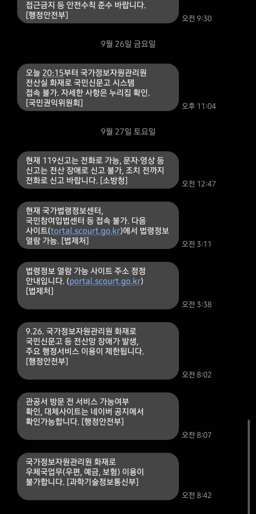 대전 국가정보자원관리원 화재로 밤새 경보 겁나옴