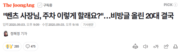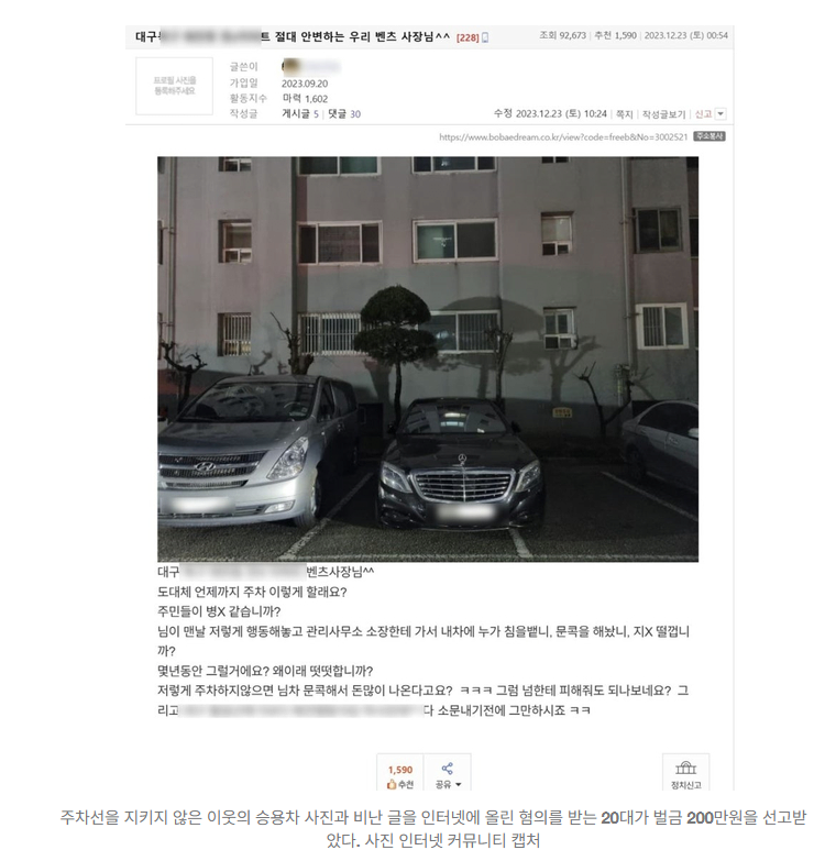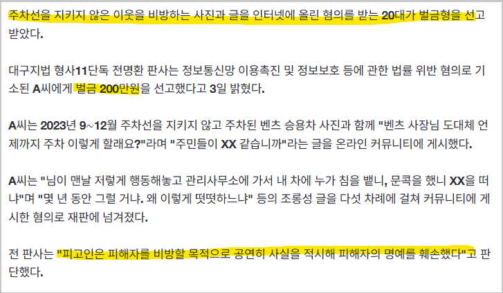 "벤츠 사장님, 주차 이렇게 할래요?"…비방글 올린 20대 결국 안생기지않아 0 1004 0 0 09.08 13:00 주소복사 복사되었습니다! 피고인(20대 글올린사람)은 피해자(벤츠 차주)를 0 0