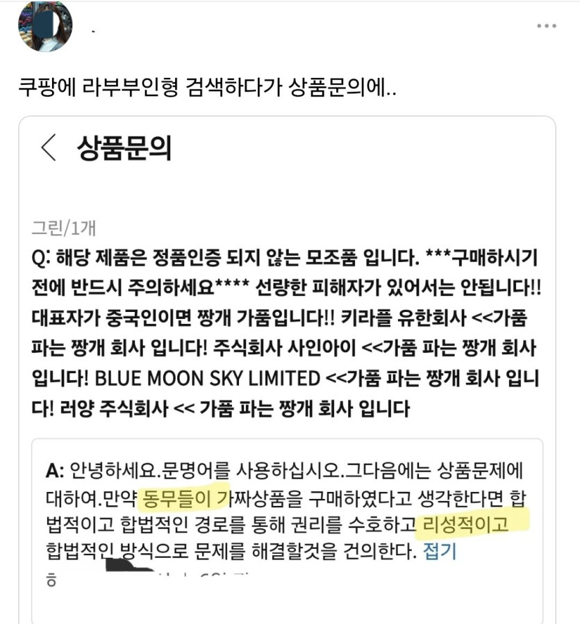 충격) 쿠팡에 라부부인형 검색하다가 상품문의에..