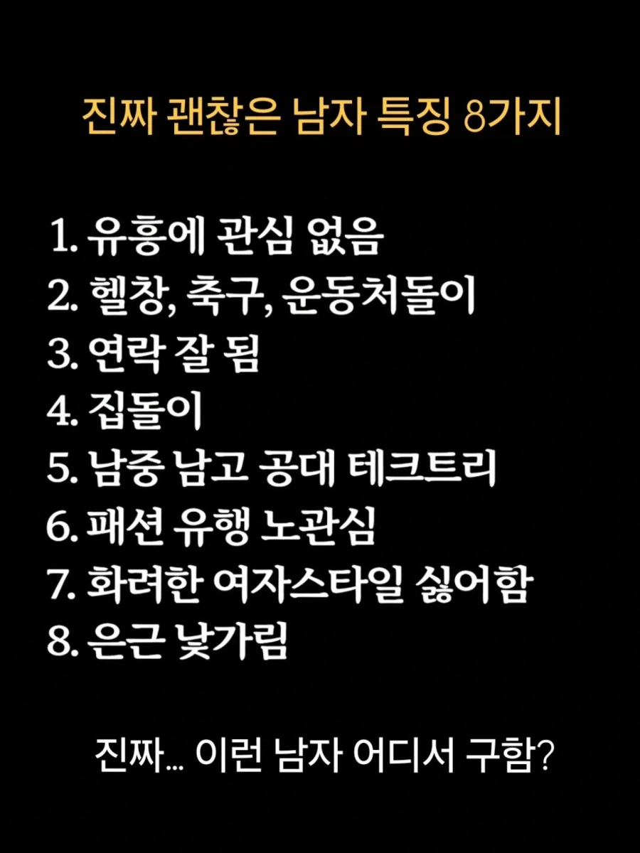 진짜 괜찮은 남자 조건 8가지 vㅡㅡㅋ아싸 8 13 0 0 3시간전 주소복사 복사되었습니다! 진짜 괜찮은 남자 조건 8가지 사실 저런 조건의 남자는 널리고 널렸음. 존나 잘생겨야된다는 조건이 붙으면 갑자기 희귀해짐. 0 0