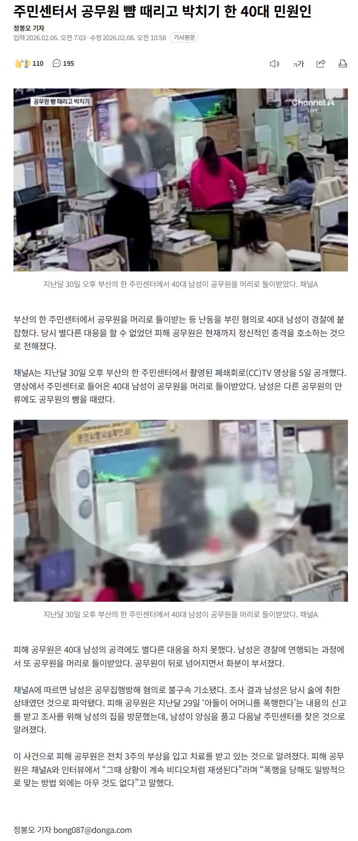 주민센터서 공무원 뺨 때리고 박치기 한 40대 민원인