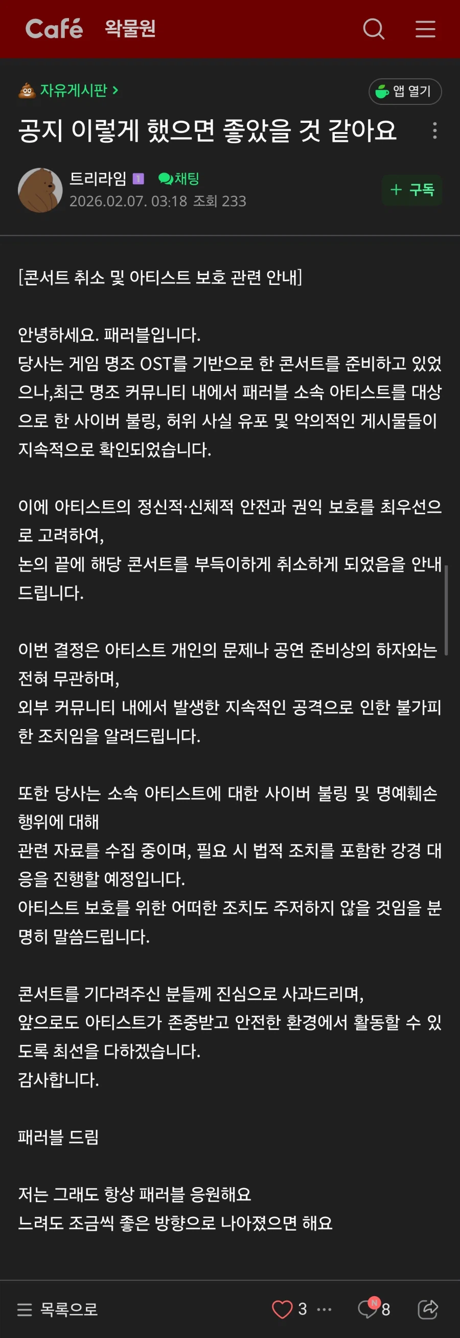 ㅇㅇㄱ) 공지 이렇게나와야 정상아님? 아비닉이 6 14 0 0 3시간전 주소복사 복사되었습니다! ㅇㅇㄱ) 공지 이렇게나와야 정상아님? 저런식으로 쓰면 콘서트에 굴나오는걸 인정하는 건데 패러블이 하겠냐 굴단아 0 0