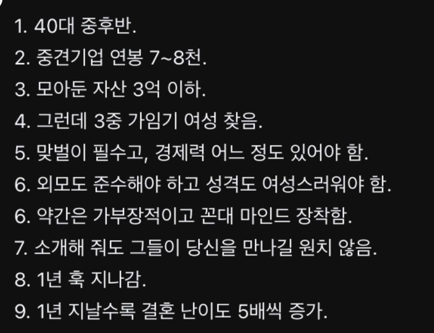 결정사에서 나쁘지 않지만 결혼 매우힘들다는 40대남 스펙 마싰는데 8 19 0 0 1시간전 주소복사 복사되었습니다! 저 스펙과 자산으로는 저정도 상대 찾는건 현실에서는 매우 힘들다고 함ㄷㄷㄷ 0 0