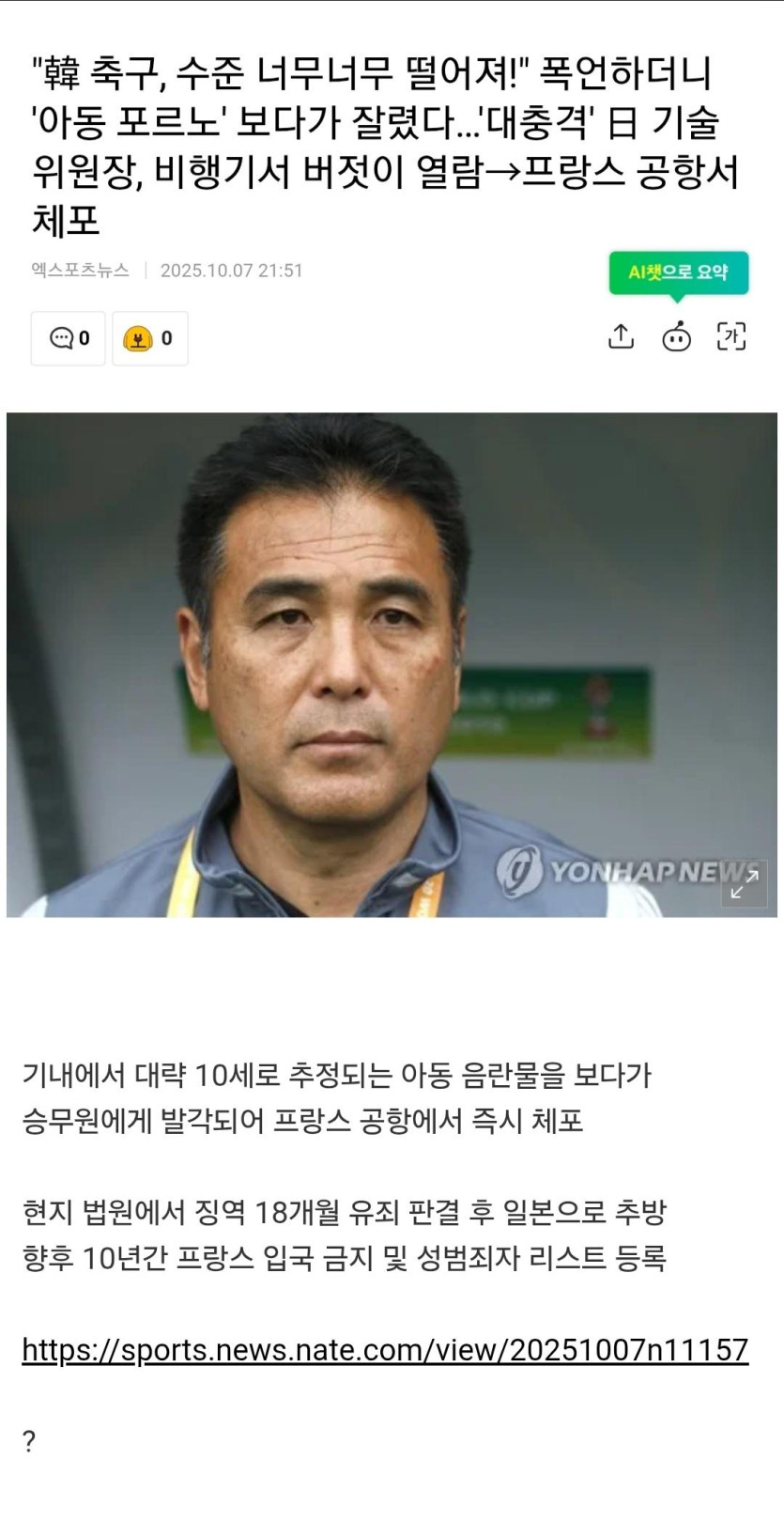 일본 축구 기술위원장, 기내에서 아동포르노 보다가 프랑스에서 체포