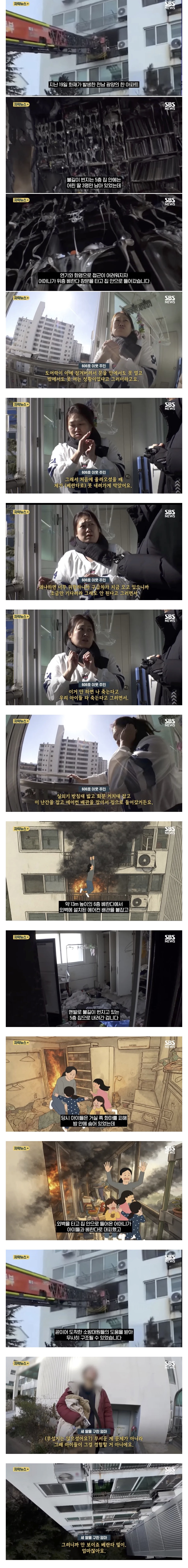 “이거 안 하면 나 죽는다” 영국남자 0 79 0 0 02.01 12:44 주소복사 복사되었습니다! 1. 아파트 5층에서 불이 남2. 집에는 어린 딸 3명만 있는 상황3. 엄마가 윗층 베란다 통해서 집으로 들어가려고 함4. 윗집 주인이 말렸으나 이거 안 하면 나 죽는다고 배관 타고 내려감5. 무사히 구출6. 엄마는 당시에 베란다 밑이 얼마나 높은지 보이지 않았다고 함 0 0