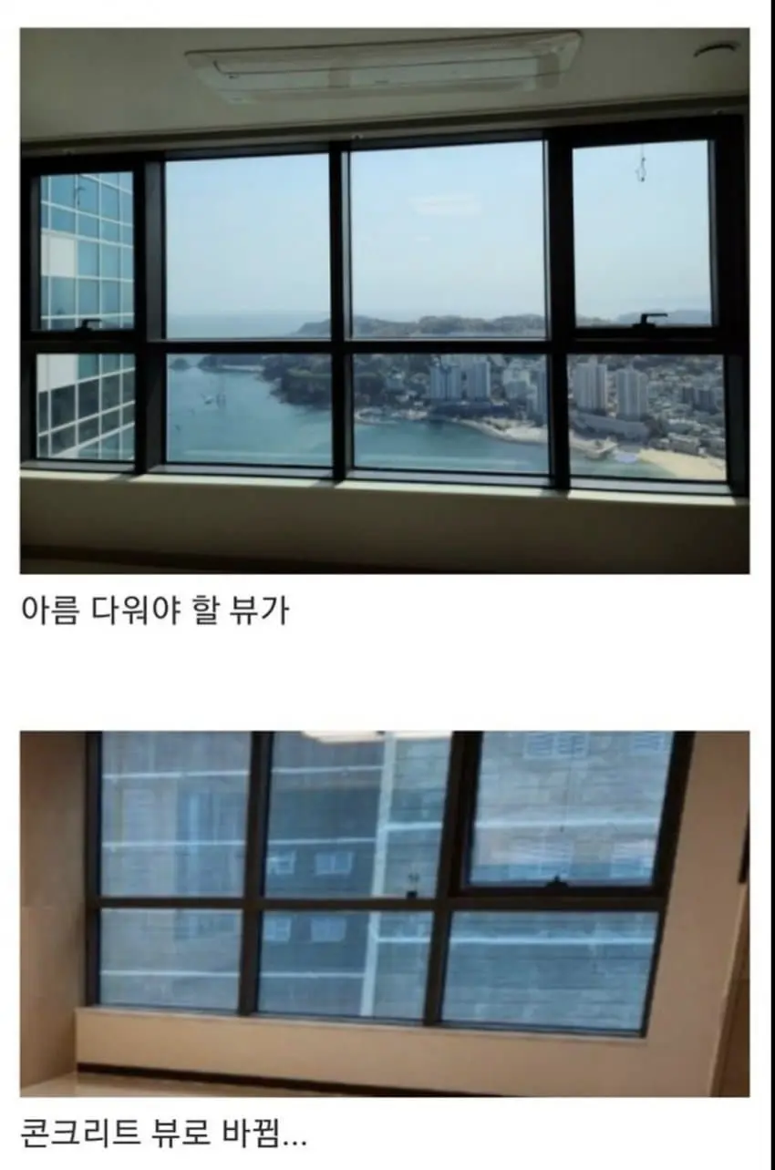 부산 해변 오션뷰 아파트 낭패 마지막연금술 0 38 0 0 10.18 03:22 주소복사 복사되었습니다! 송도 해변 앞 최고 69층으로 지은 오션뷰 아파트... ..의 앞에 남는땅이 있었음.. 아파트에서도 전혀 예상을 못했는지 195.m2(59평) 제일 큰 평수가 붙음 뚝딱뚝딱... 0 0