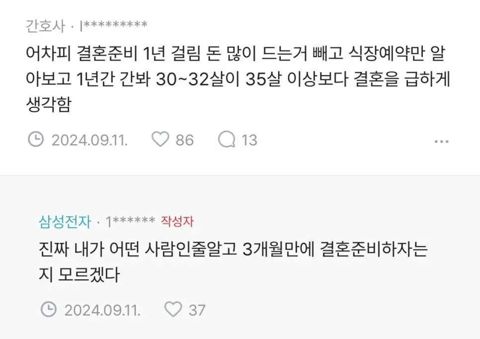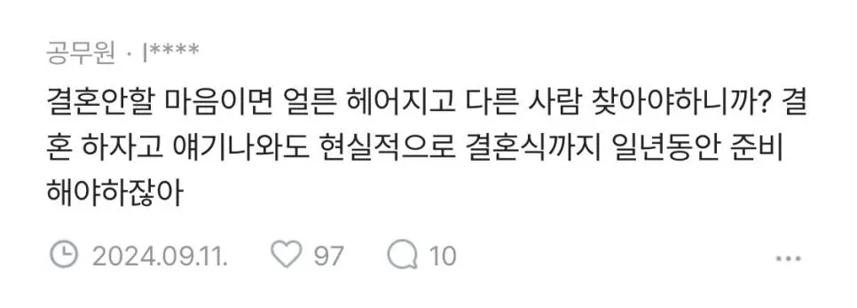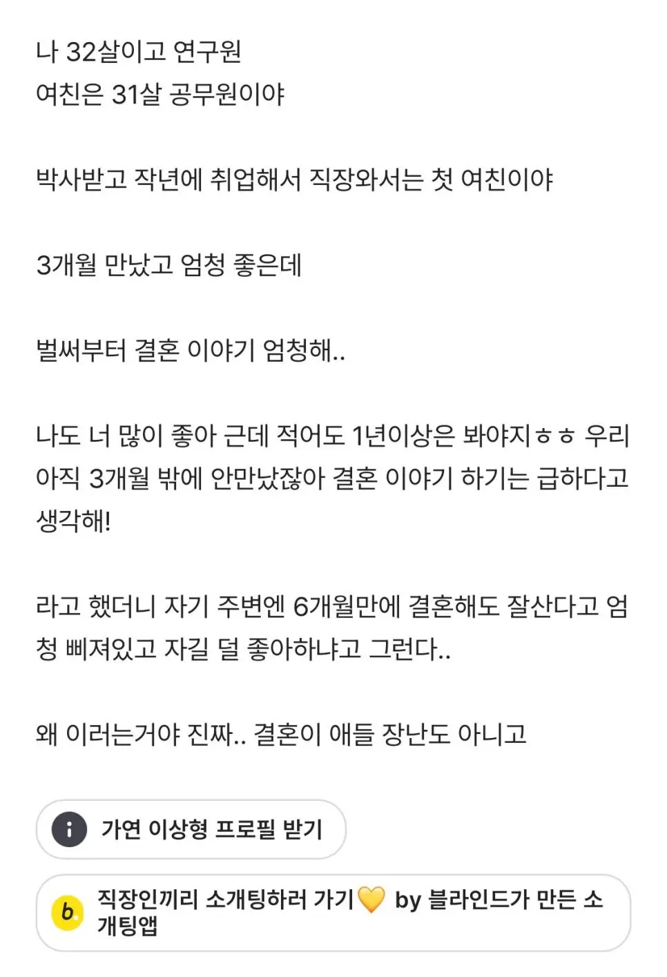 3개월 된 여친이 결혼 이야기해..blind 오유인중한명 0 28 0 0 10.22 16:22 주소복사 복사되었습니다! 남자 32살 vs 여자 31살 남자: 아직 3개월인데 너무 이르다 여자들: 결혼 준비하는 기간이 있어서 빨리 진행해야된다 0 0