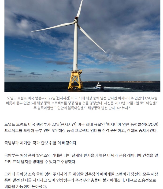 트럼프, 해상 풍력 발전 프로젝트 전면 중지 ㄷㄷ