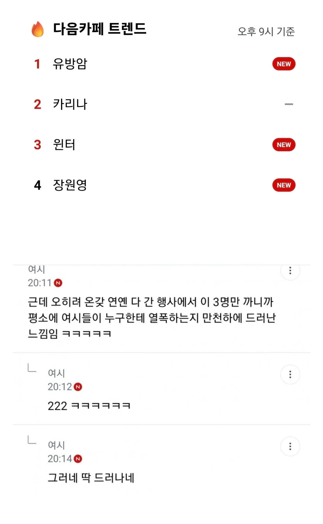 여시의 민낯을 본 거 같다는 다음카페 트렌드 쁘띠슉슉 0 78 0 0 10.17 18:42 주소복사 복사되었습니다! 이번 유방암행사 논란때문에 저 세명만 특히 욕먹음 행사 참여한 90여명의 연예인 중 욕먹는 탑3 0 0