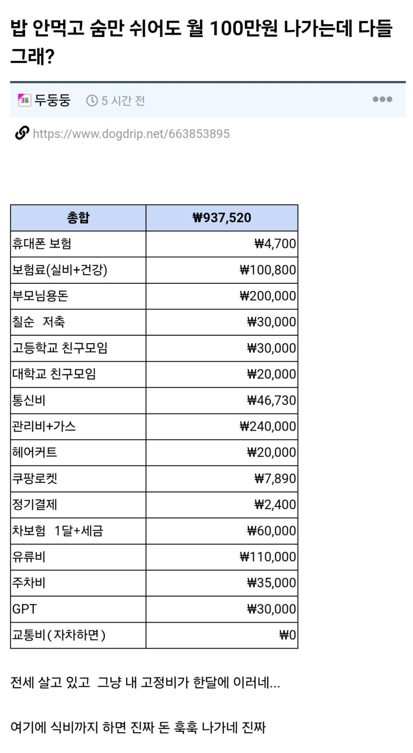 밥 안먹고 숨만 쉬어도 월 100만원 나가는데 다들 그래? jpg