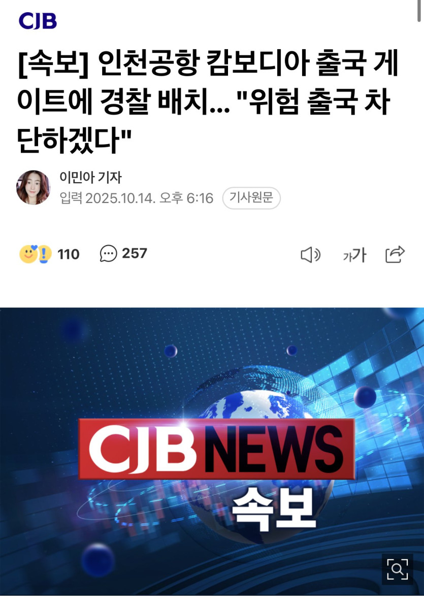 [속보] 인천공항 캄보디아 출국 게이트에 경찰 배치... "위험 출국... 모모아이 0 7 0 0 10.14 21:00 주소복사 복사되었습니다! https://n.news.naver.com/article/655/0000027853?type=breakingnews&cds=news_my_20s 0 0