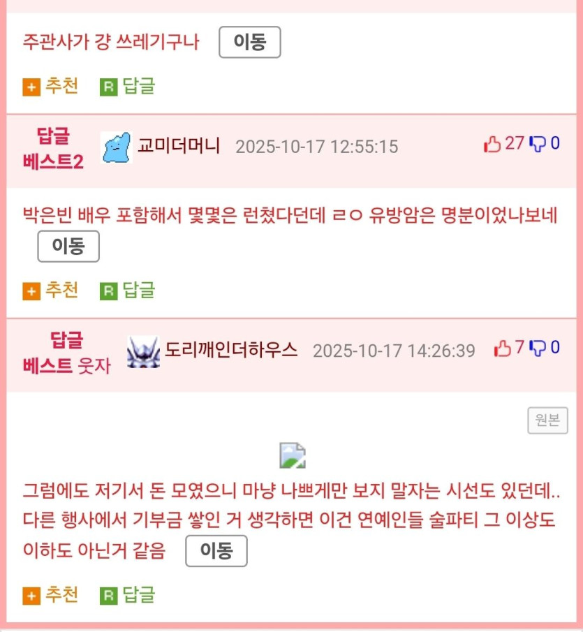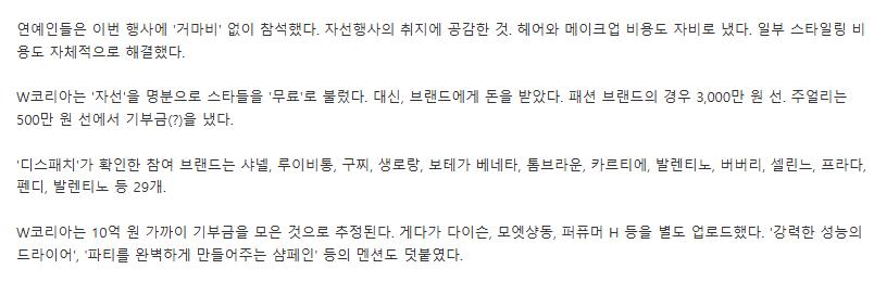 디스패치가 깐 W코리아 유방암 자선행사 시스템 욕망창고 0 0 0 0 2시간전 주소복사 복사되었습니다! 1. 명품 브랜드가 돈과 옷을 제공 (브랜드당 500~3000만원 정도 낸다고함) 2. W코리아는 연예인들 불러다 의상 지정해서 옷 입히고 포토월에 세워서 광고시켜줌 3. 스타킹 하나라도 제대로 착용 못하면 포토월에도 안세움 (배우 박보영 이라고함) 4. 입장 후엔 스텝 동반 불가, 유방암 관련 질문은 안하고 챌린지 시키고, 오늘 거울 몇번 봤어요? 애교 3종세트 이런거 물어봄 5. 사전 협의 없는 질문들에 소속사 관계자들도 난감 0 0