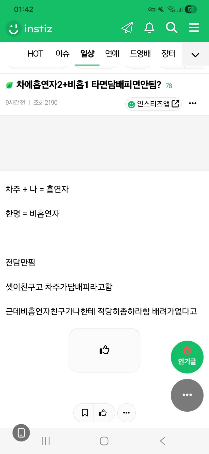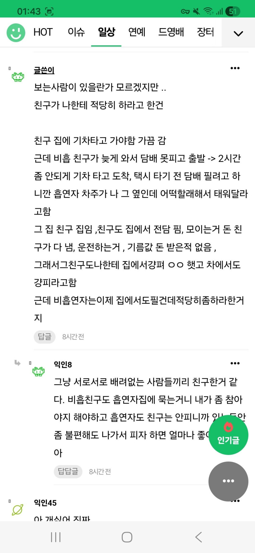 차에흡연자2+비흡1 타면담배피면안됨? 레전드레옹 0 6 0 0 3시간전 주소복사 복사되었습니다! 그래도 비흡연자앞에서 담배는좀 vs 태워달라서 태워주고 돈도 안받는데 너무한거아님??? 0 0