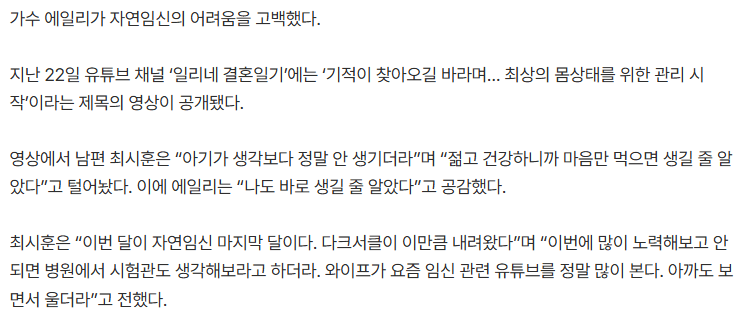 에일리, 눈물 고백 “자연임신 어려워…바로 생길 줄 알았는데”