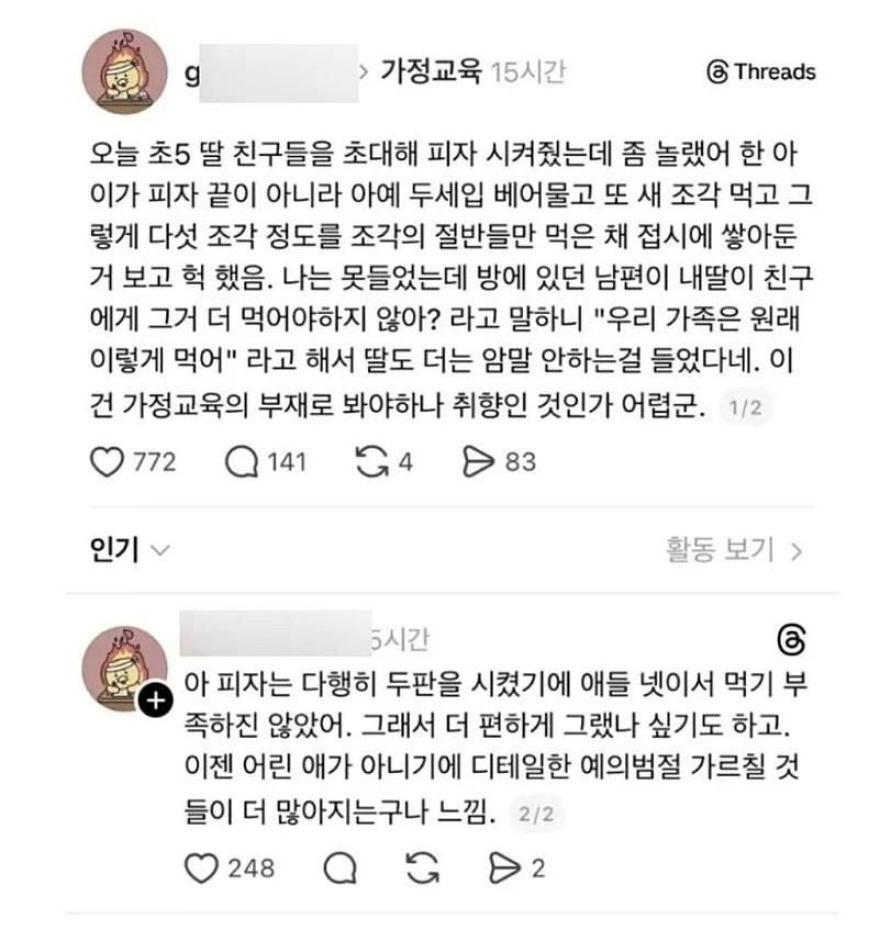 가정교육의 중요성 후니훈2 0 11 0 0 1시간전 주소복사 복사되었습니다! 침착맨이 했던 말이 농담이 아니었음 자식 앞에서 잔반 먹으면 부모를 잔반 먹는 사람으로 인식한다더니...ㄷㄷ 자기 자식 귀한건 알겠지만 이런 밥상머리 교육은 진짜 집이 아니면 배울곳이 없음 오냐오냐하고 키우는게 과연 진짜 자식을 위한 일인지 생각해봐야함 내가 귀하게 키우면 뭐하나 저 상태론 밖에선 귀한 대접을 못받을텐데 0 0