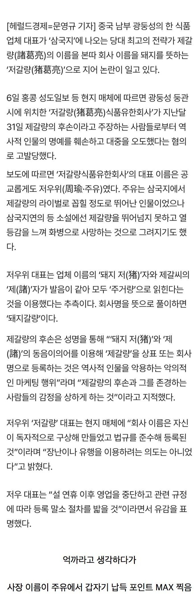 회사 이름을 “저갈량”이라고 지어 논란.jpg