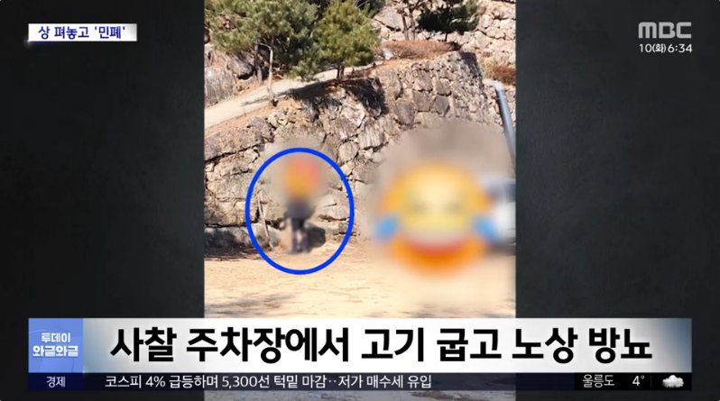 설마 했는데… 네, 맞습니다. 사찰 주변에서 고기를 굽는 모습인데요.