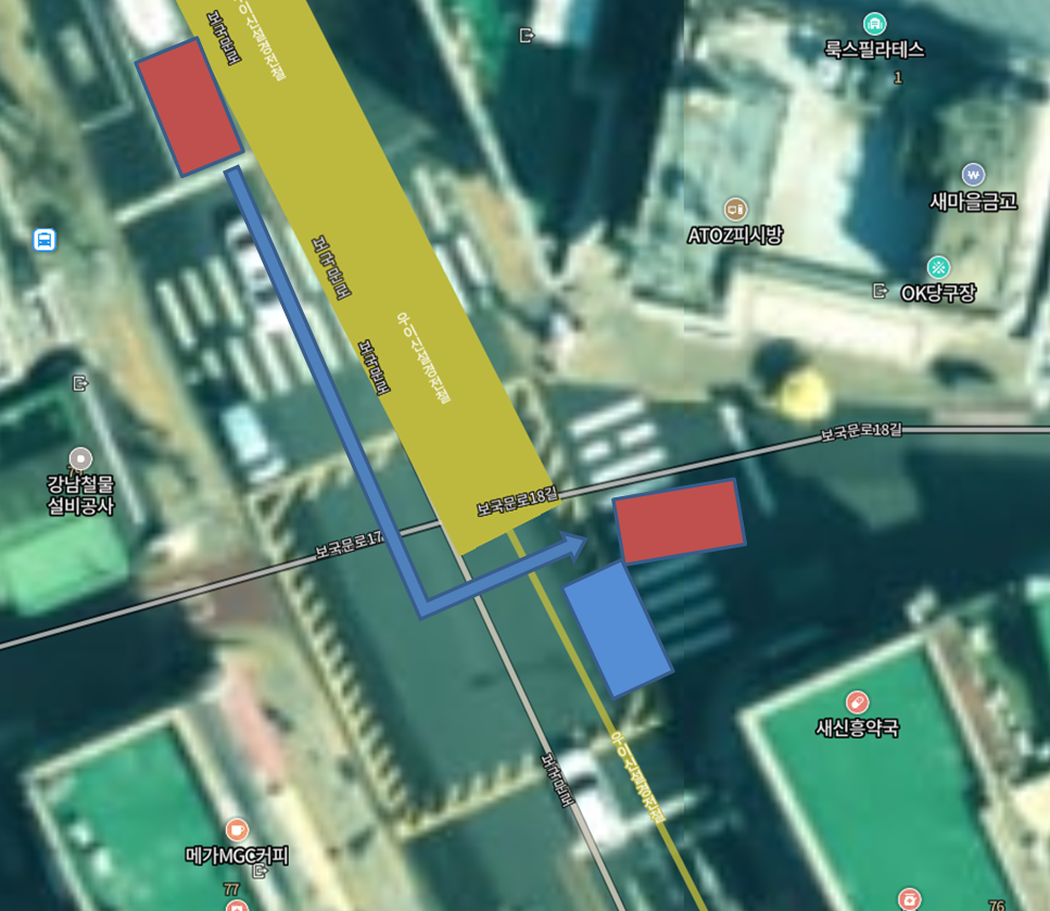 사진처럼 빨간색이 아버지 차(포터)고 파란색이 상대 차입니다. 좌회전시 상대차는 멀리 있어서 좌회전에 문제 없을거라