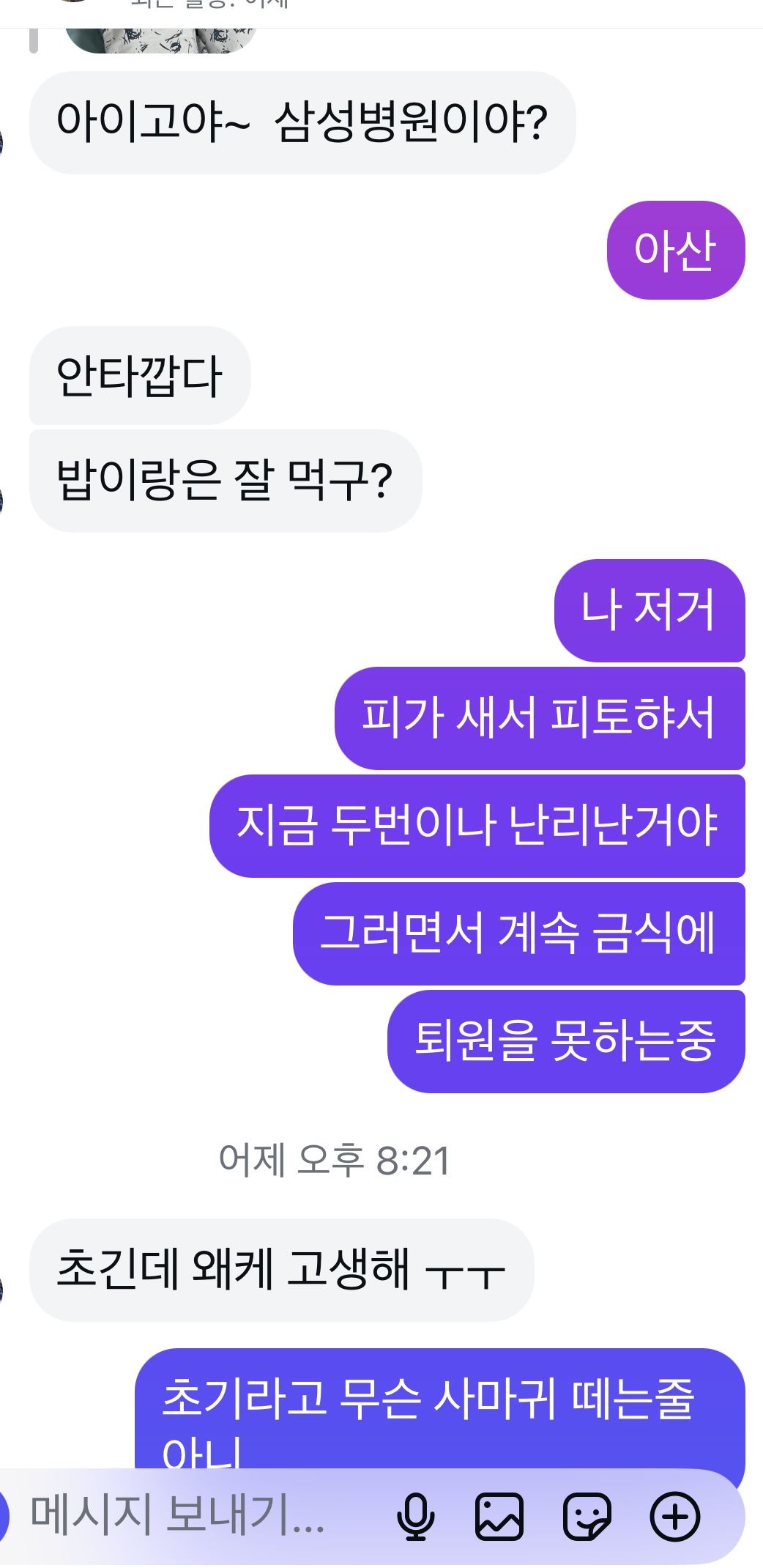 답답.jpg ㅹㅹ 0 9 0 0 1시간전 주소복사 복사되었습니다! 퇴원 기다리는중입니다 ㅋ 오늘은 친구 얘기를 해볼께요 아시다시피(?) 두번 피토하고 주사맞고 잇는데 연락받고 욱햇음 또 한친구는 갑상선암이엇는데 자기도 다 해봣다고 곧 괜찮아질꺼라는데 아 또 욱햇음 그치만 지금은 곧 퇴원이라 웃고 넘기…려고요 ㅋㅋㅋㅋㅋ 0 0