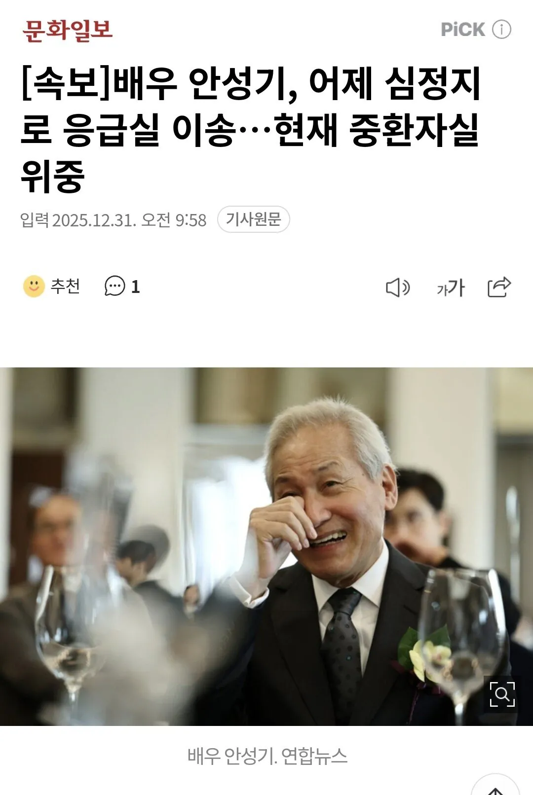 [속보]배우 안성기, 어제 심정지로 응급실 이송…현재 중환자실 위중