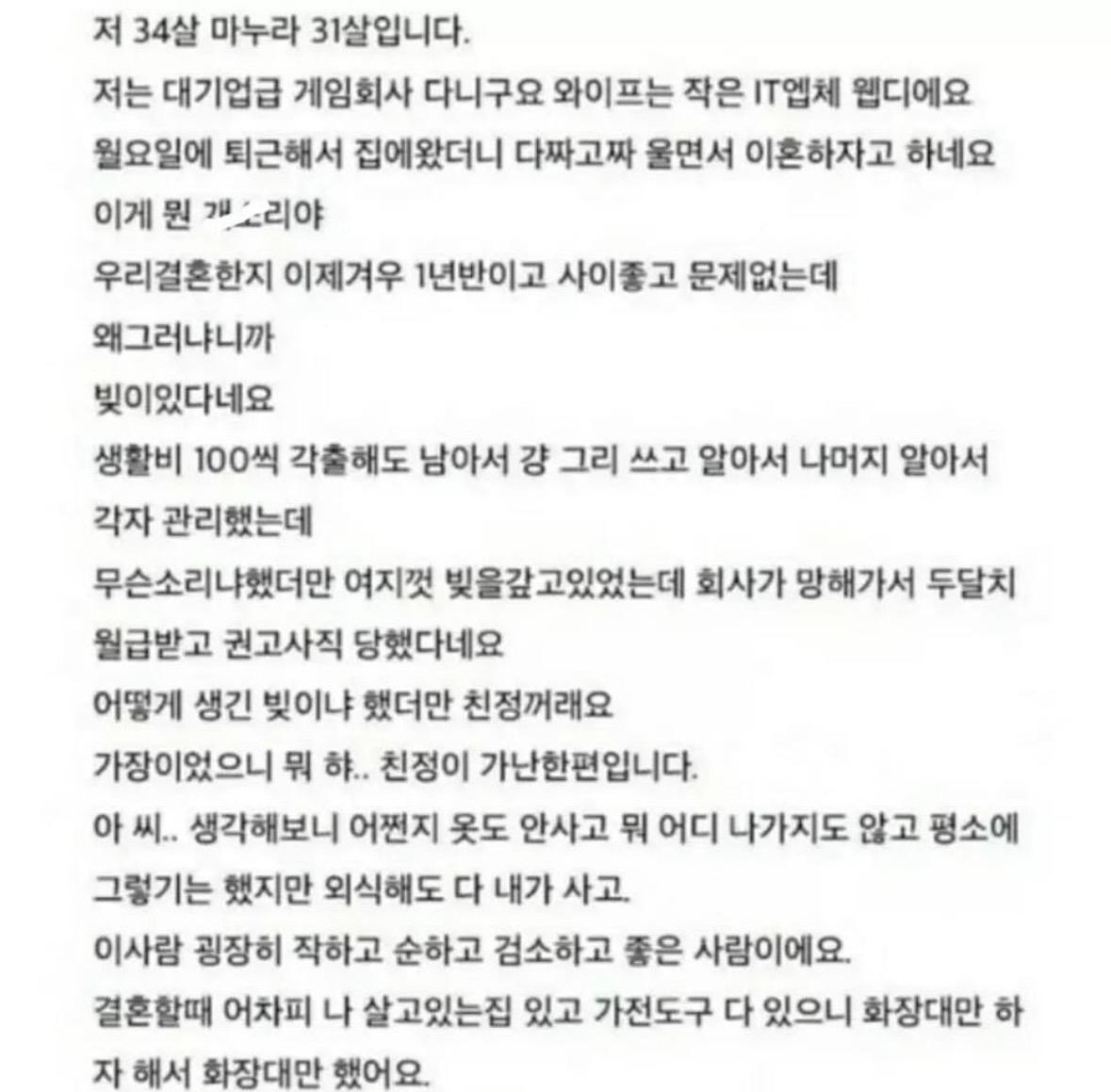 퇴근하고 집에오니 와이프가 이혼하자합니다