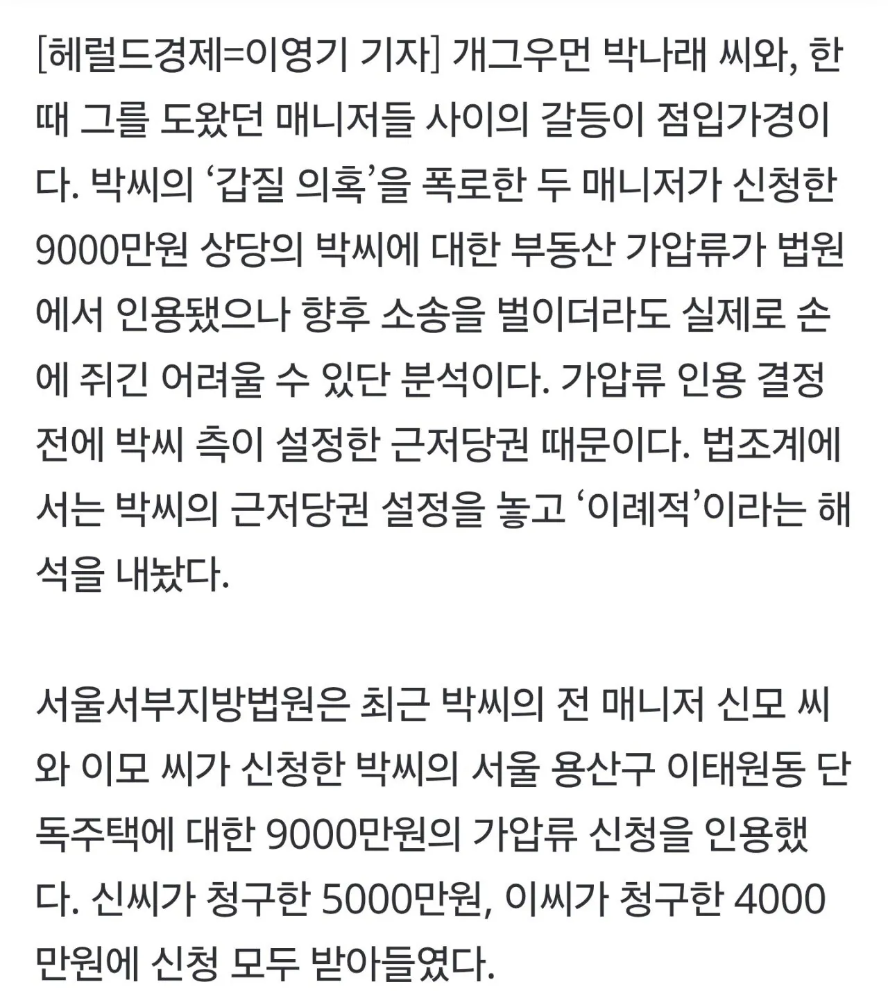 박나래 용산집 가압류 무용지물…50억 셀프 근저당에 막혔다
