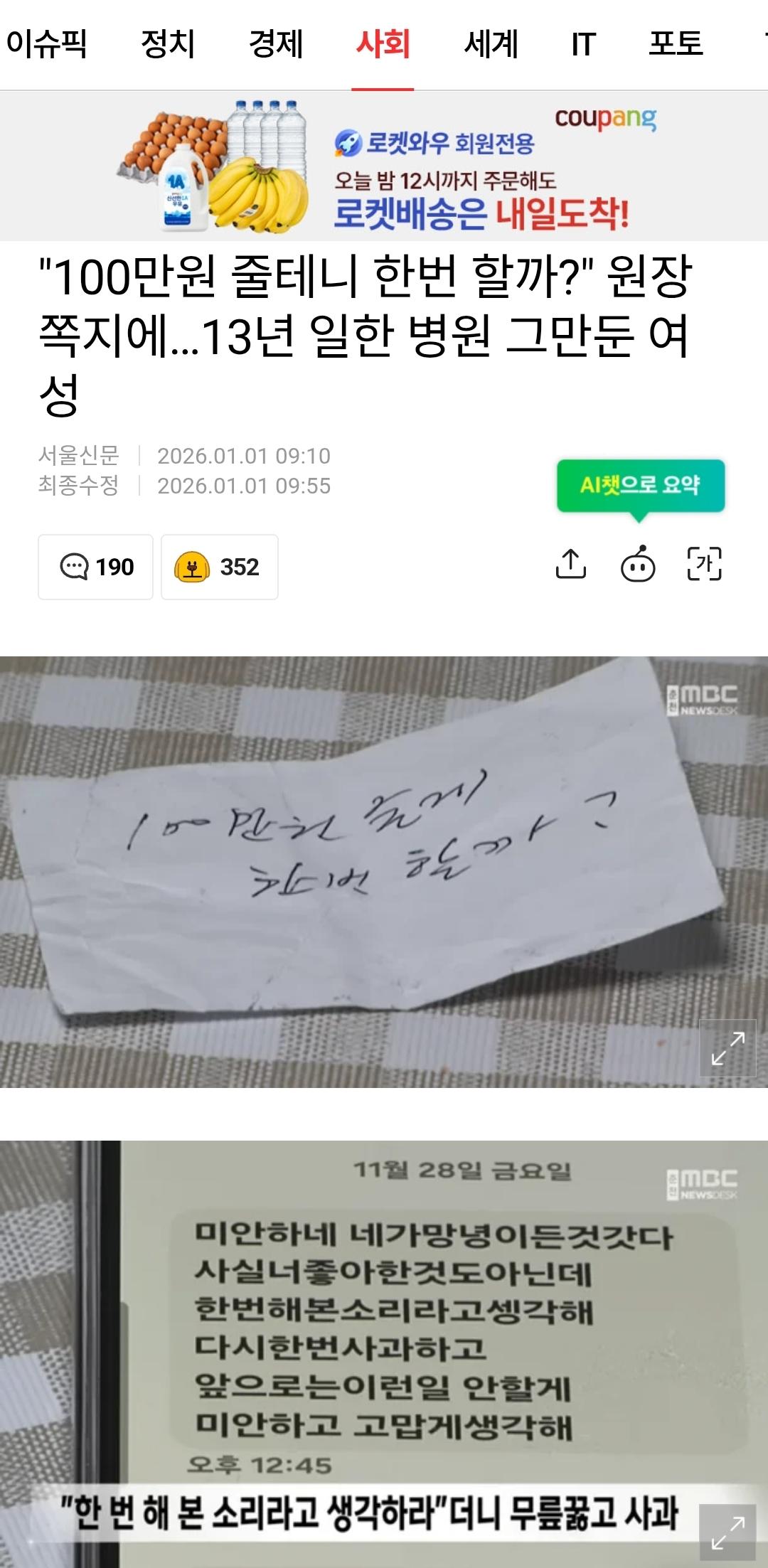 100만원 줄테니 한번 할까?" 원장 쪽지에…13년 일한 병원 그만둔 여성