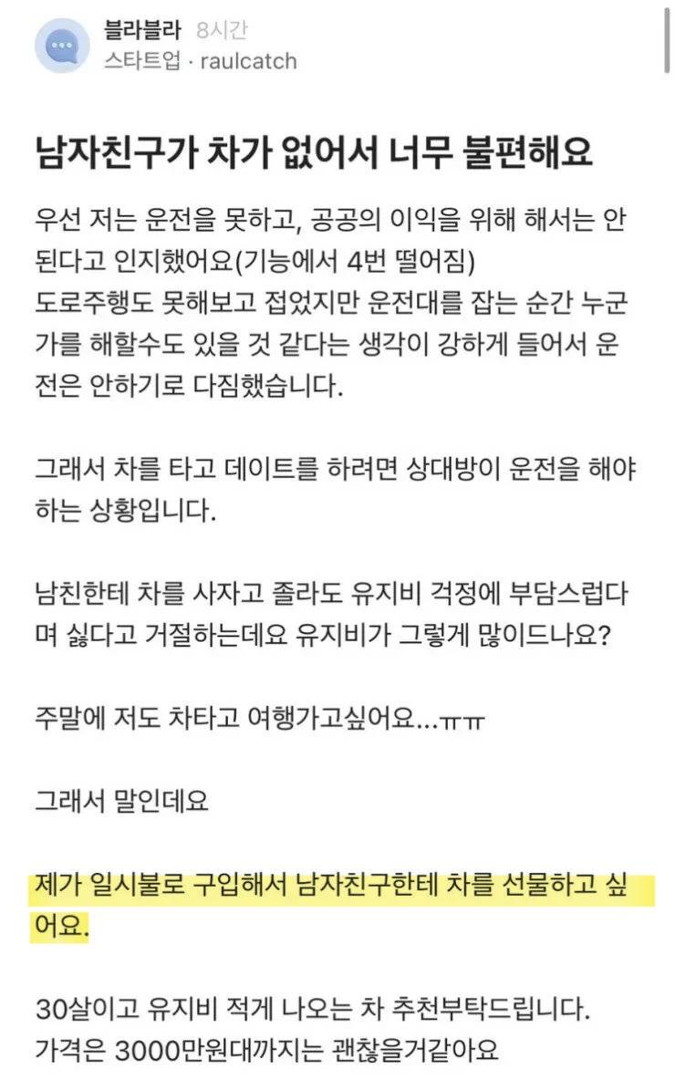 남자친구가 차가 없어서 너무 불편하다는 여성... 오이냉채 0 5 0 0 1시간전 주소복사 복사되었습니다! 또 지랄이다 하면서 읽다가 자격이 충분한 이해되는 불평입니다.ㅋ 아반떼 급이면 충분하지 않나요? 첫차인데 쓸만한 중고도 괜찮고요. 0 0