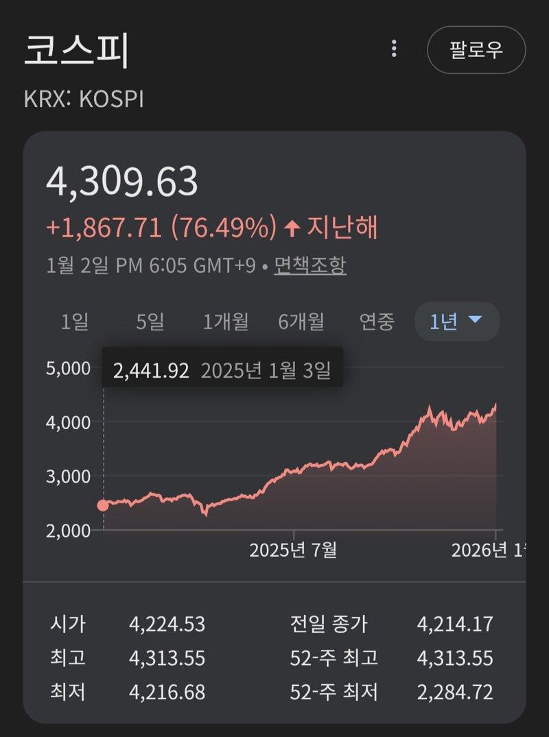 1년 전 환율 코스피, 현재와 오직 팩트 비교 렌땅나우 0 23 0 0 01.03 18:45 주소복사 복사되었습니다! 정신병자 2찌기식 거짖 선동, 생때가 아닌 오직 이성과 팩트! 1년 전 코스피: 2441 환율 : 1466 현재 코스피: 4309 환율 : 1442 0 0