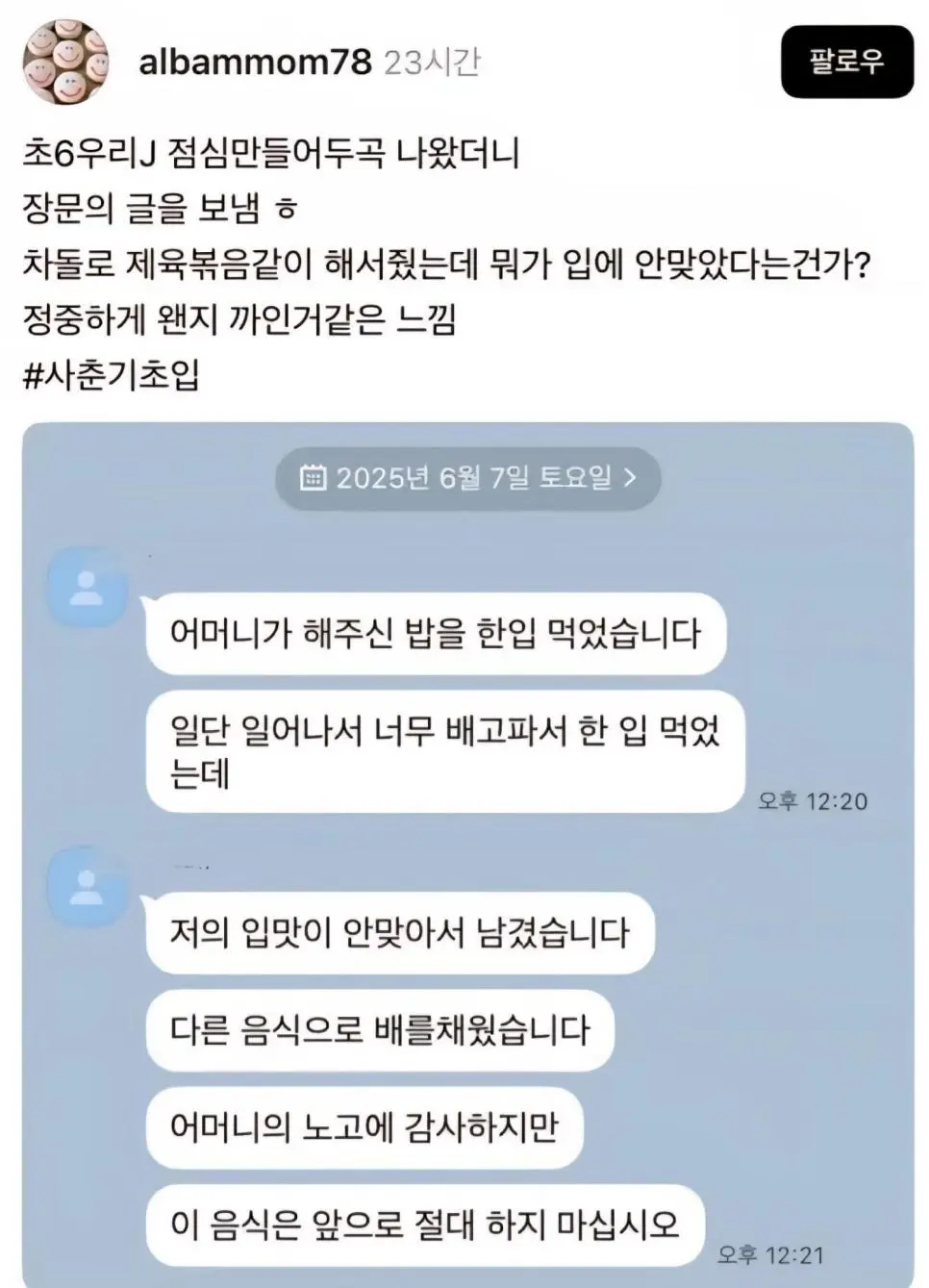 초등학생 6학년이 엄마에게 카톡으로 남긴 말