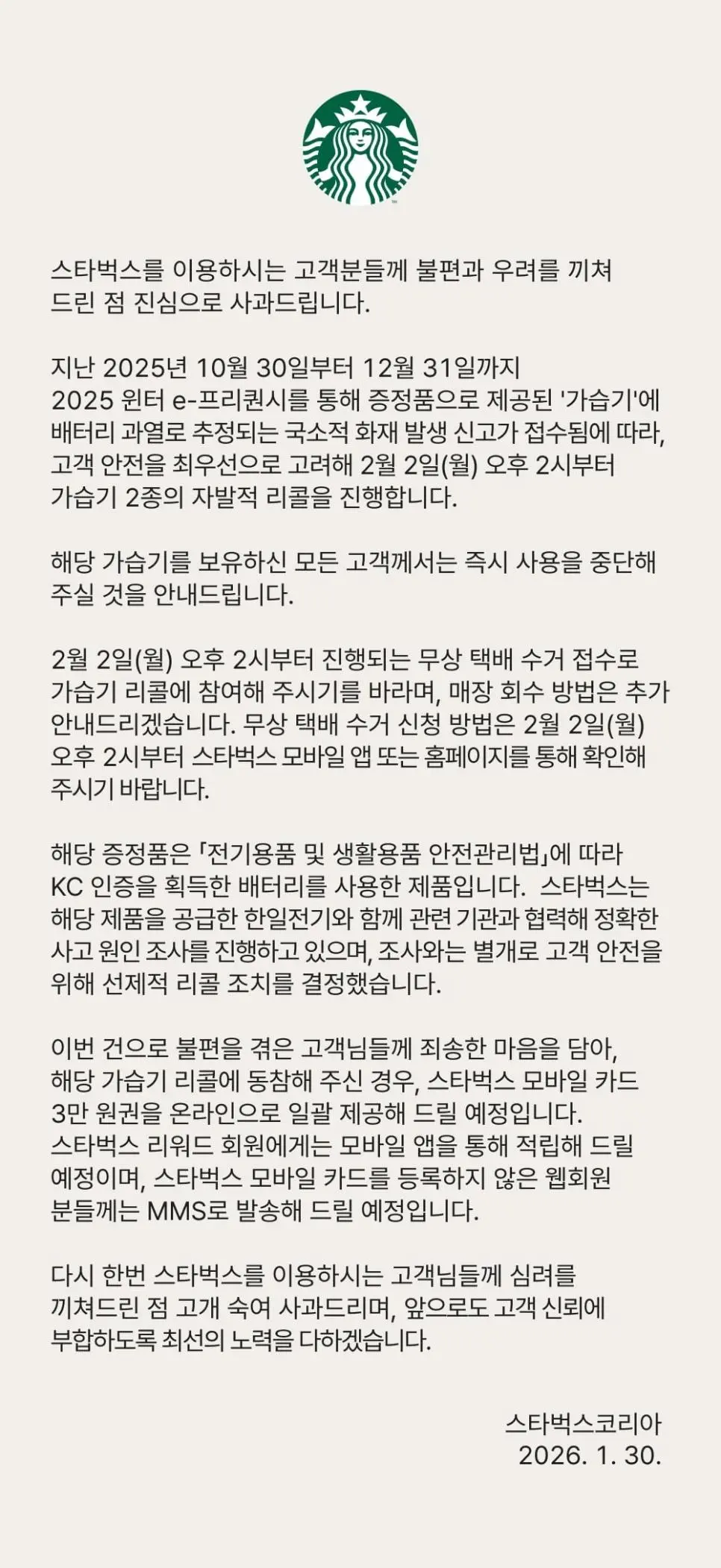 스타벅스 가습기(이프리퀀시 증정품) 리콜