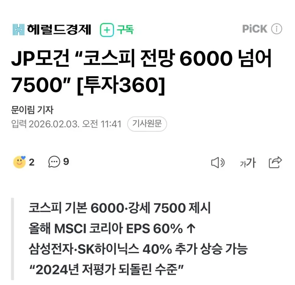 JP모건 “코스피 전망 6000넘어 7500” 평범한대딩 0 7 0 0 2시간전 주소복사 복사되었습니다! https://n.news.naver.com/mnews/article/016/0002595178 안늦었다 타라 0 0