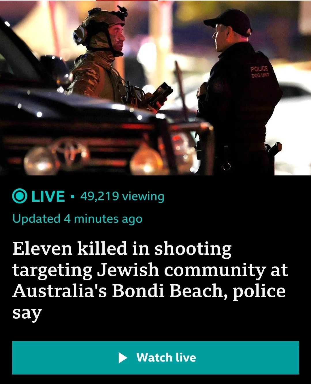 [BBC] 호주 총기난사 사건, 유대인 테러일 확률 높음 샛별뿌리 0 29 0 0 12.14 23:56 주소복사 복사되었습니다! https://www.bbc.com/news/live/ckgk391yzm7t 당시 해당 해변에 유대교 축제인 하누카가 진행 중이였다고 함 0 0