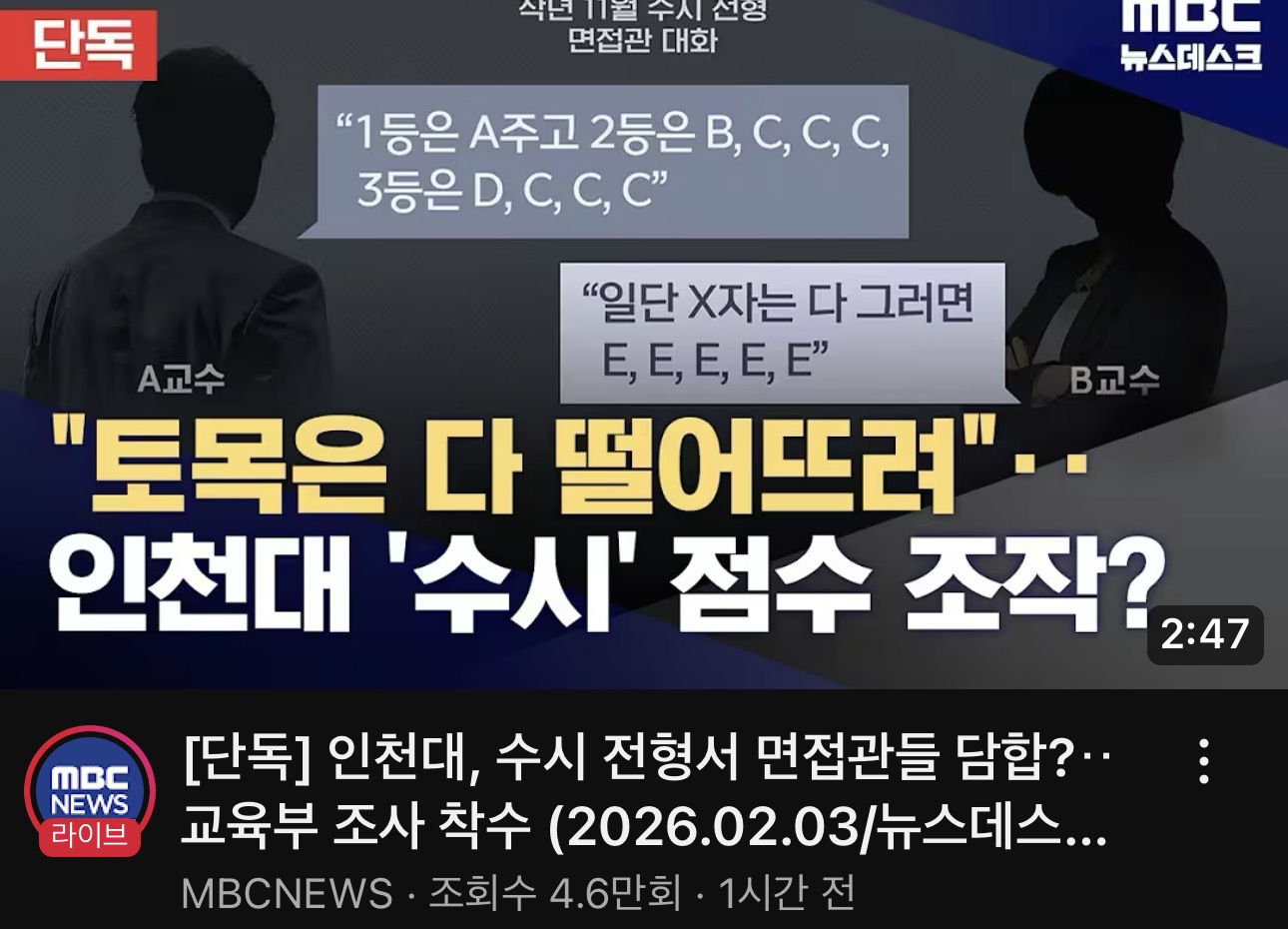 "토목은 다 떨어뜨려"… 인천대 수시 점수 조작?
