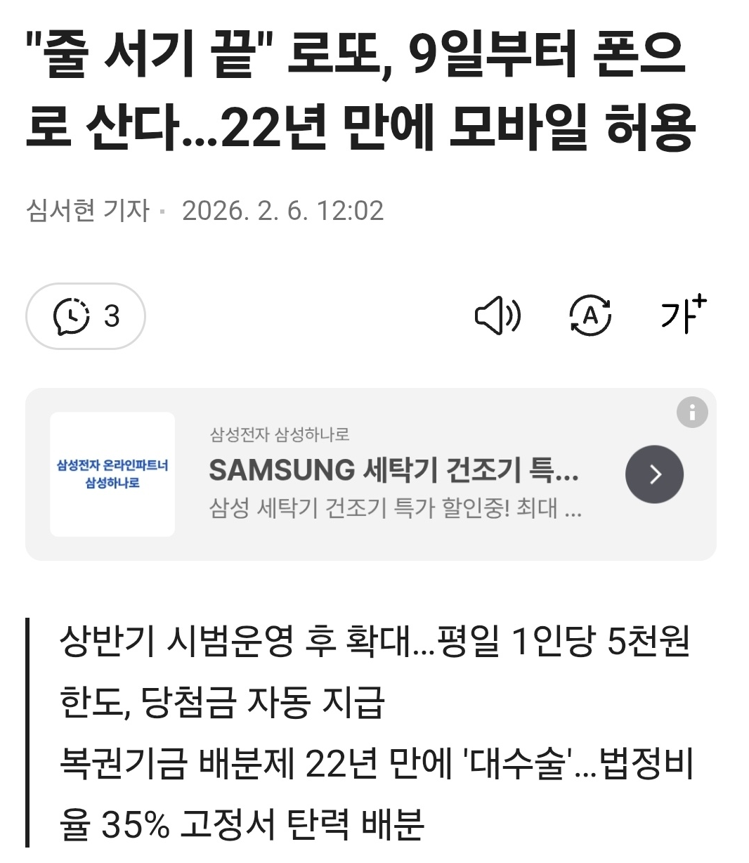 이제 모바일로도 로또 구입가능하네요. MusicianXD 2 16 0 0 1시간전 주소복사 복사되었습니다! 그동안 PC에서만 구매 가능했군요. http://v.daum.net/v/20260206120229137 0 0